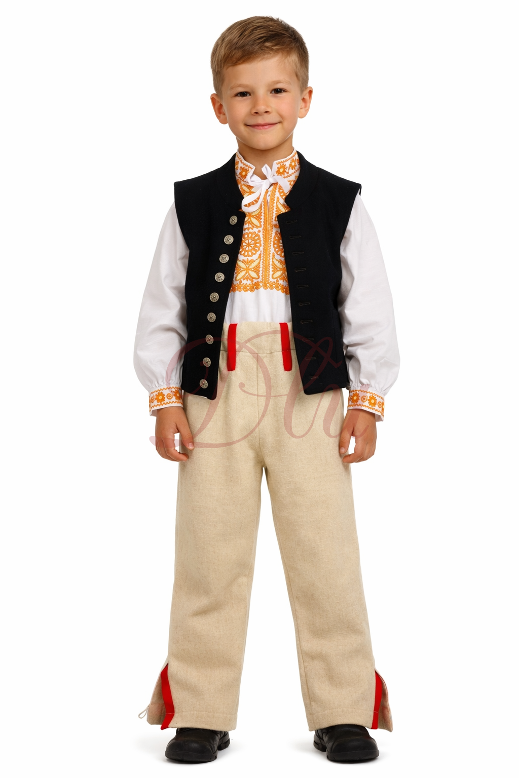 Chlapčenský detviansky kroj  s ručne vyšívanou košeľou v oranžovej farbe. Súčasťou sú súkenné nohavice a čierna vesta s tradičnými detailmi.