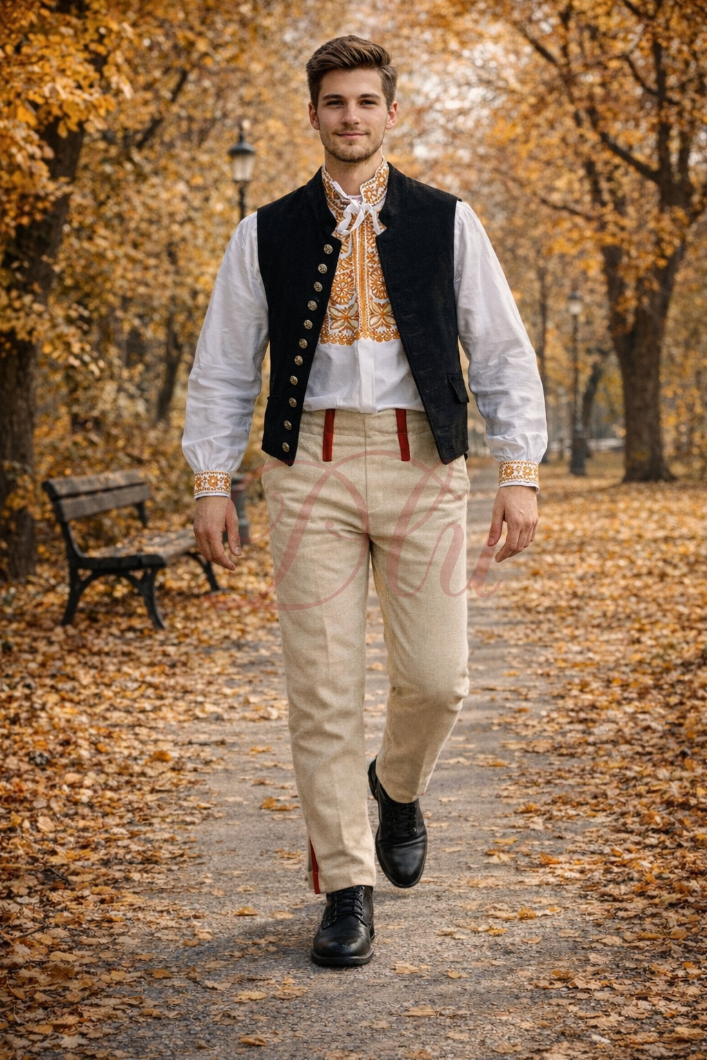 Tradičný mužský kroj z Podpoľania so súkennými nohavicami a ručne vyšívanou dlhou košeľou.